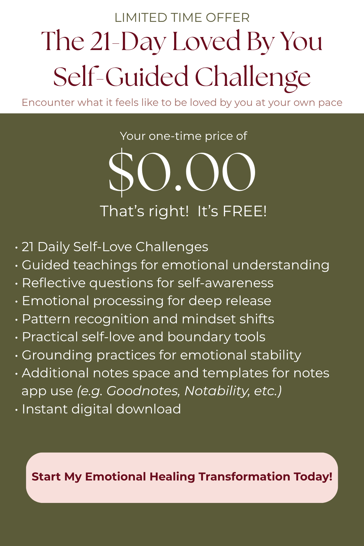 THE 21-DAY LOVED BY YOU CHALLENGE IS YOUR COMPASSIONATE, POWER-PACKED PATH TO EMOTIONAL HEALING, REGULATION, AND FINALLY CHOOSING YOURSELF WITHOUT APOLOGY.